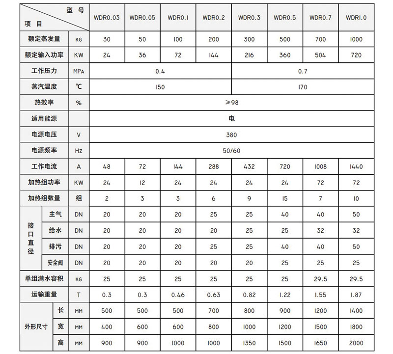 WDR電蒸汽發生器采用低表面熱負荷電熱元件,每一元件均進行水壓及耐電壓試驗;接上電源及水源后即可工作。安靜、清潔,符合環保的要求,不會向大氣排放NOx(氮氧化合物)。電蒸汽發生器操作簡便,一鍵啟動、停止,3分鐘出蒸汽,運行負荷調節范圍大,維護簡便。每組電熱元件采用集中束型法蘭連接,獨立設置,機械強度高,安全可靠,更換方便,使用壽命長等特點。